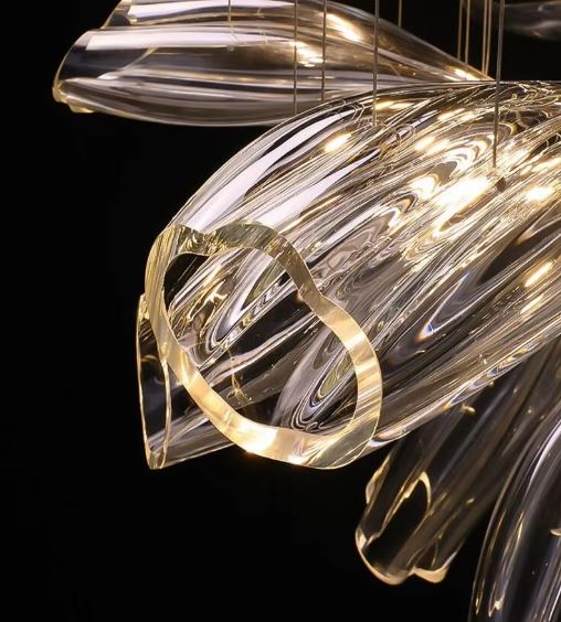 The Luxury Transparent Glass Flower Chandelier available on Light Trybe Nigeria is a stunning light fixture with a unique design made of glass pieces arranged in a flower-like shape, creating a soft, cascading effect.